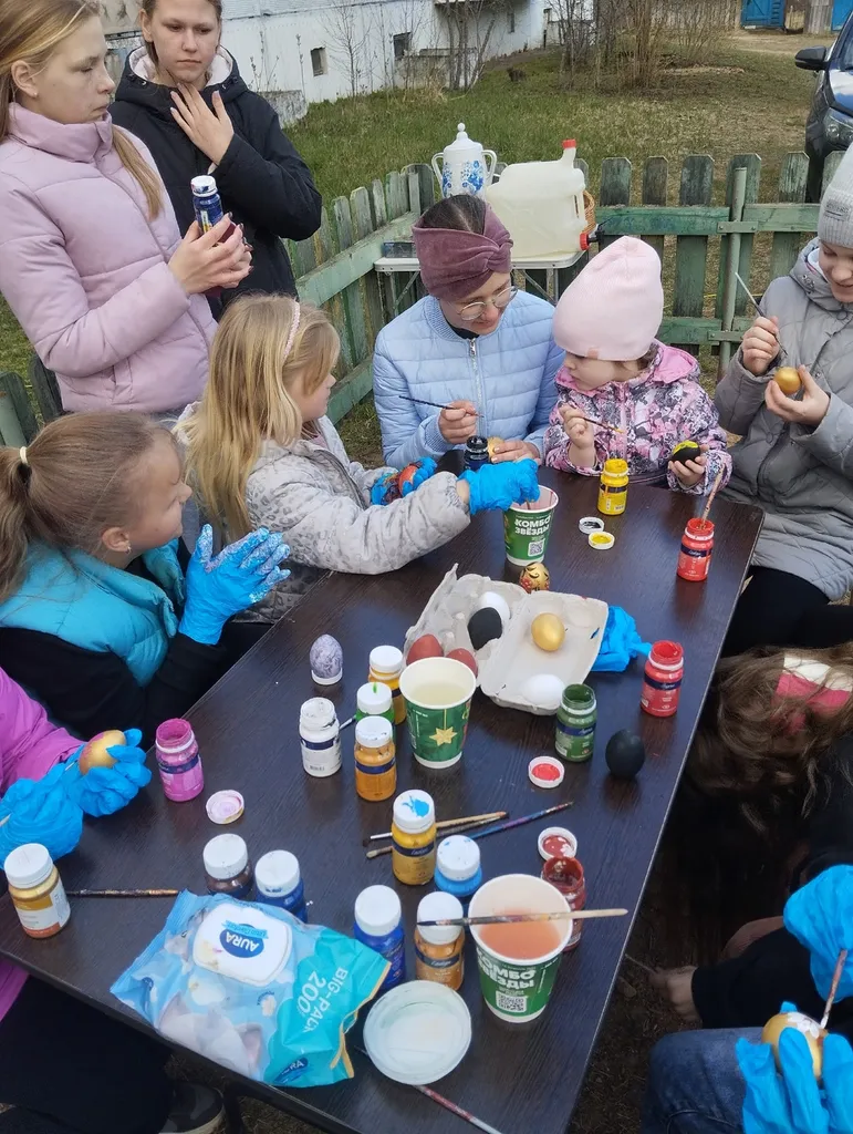 Завершился праздник творчеством. Все желающие учились расписывать яйца. Кто-то выбрал традиционные натуральные красители — куркуму, каркаде, свеклу и луковую шелуху. А ребята с удовольствием осваивали роспись деревянных яиц. И всё это время для гостей звучали песни в исполнении наших любимых «Новоржевских скобарей».